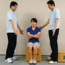 腕を組み座り、姿勢を正したまま反動をつけずにゆっくりと立ち上がります。両足と片足で行います。(測定器具セットの中に入っている40cm、30cm、20cm、10cmの台を使用)