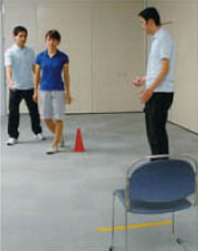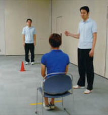 スタートの合図で立ち上がり、早歩きで目印を回って戻り、再び椅子に座ります。